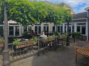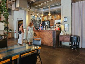 Like the Frothy Monkey in Knoxville (before it closed) Chattanooga’s has upstairs and downstairs seating. It also offers outside seating. Fortunately, while we were there, a cool breeze came along, and the sun moved behind a cloud so we took advantage of Frothy Monkey’s patio.