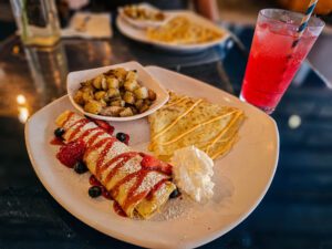 I had a couple of questions about the menu, and Adelle’s staff were so sweet to explain everything. I ordered the “Best of Both”; a 16-inch crepe split in two with half being savory and half being sweet. For my savory crepe I chose the “Better with Bacon” which featured bacon, egg and cheese with sriracha aioli drizzle. The sweet was the Triple Berry Bliss with strawberries and blueberries and Chantilly cream. Hubby and I both opted to add on the breakfast potatoes, and I added the Rise and Shine mocktail.